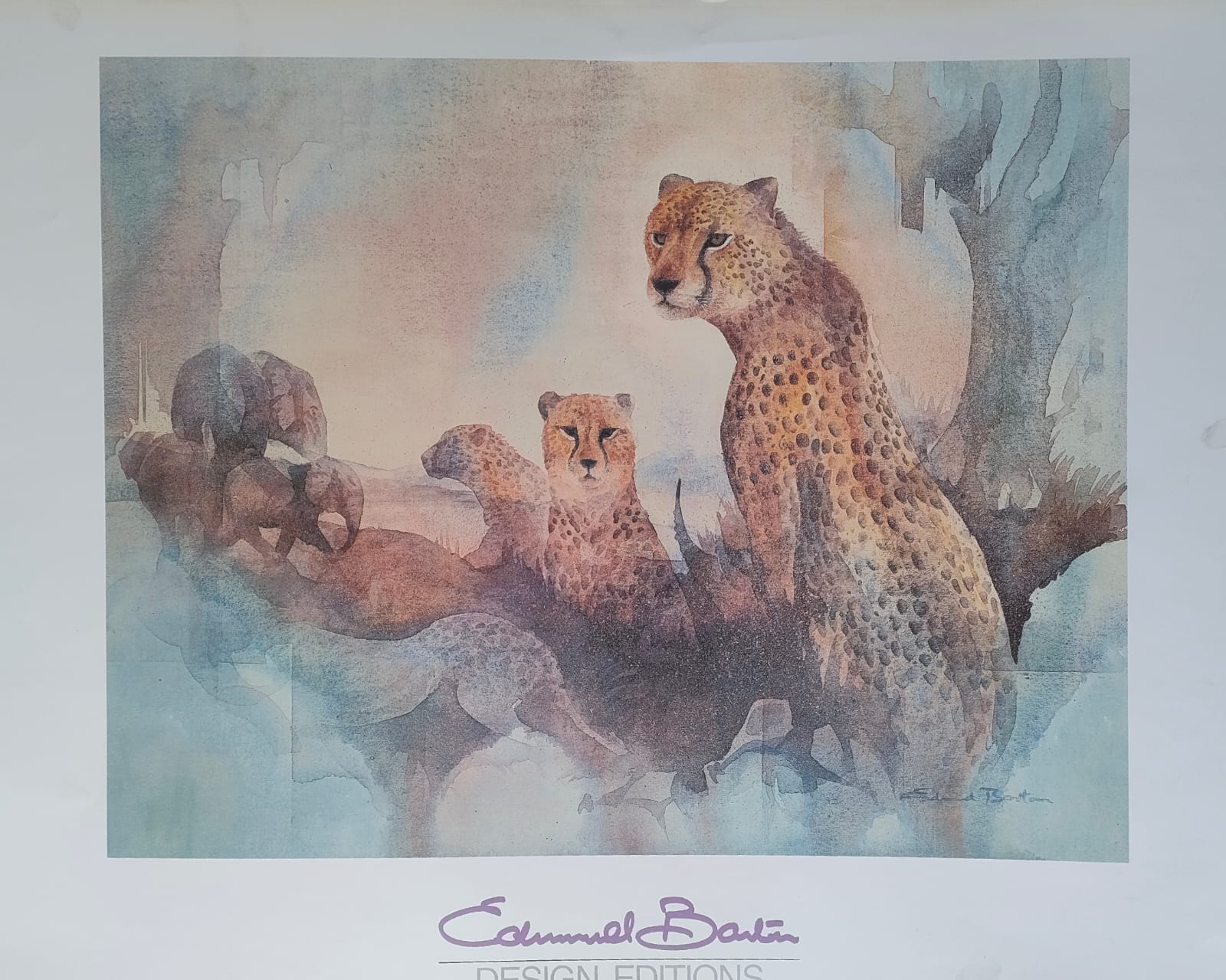 Edmund Barton, a renowned South African artist, has created several cheetah-themed oil paintings that showcase his talent for capturing wildlife with vivid realism and dynamic composition. One notable piece titled “Four Cheetahs” (67 x 68 cm, oil on canvas) presents a striking portrayal of these majestic animals, likely emphasizing their sleek forms, expressive eyes, and the tension of movement or rest in a natural setting. Size: 92 x 71cm